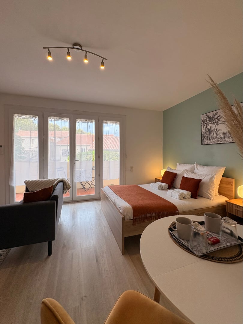 Azur • Idéalement situé à Narbonne, à deux pas de la gare et du centre-ville, cet appartement confortable et spacieux de 55 m² est parfait pour un séjour pratique en famille ou entre amis. Situé au 2ᵉ étage sans ascenseur, quelques marches sont à prévoir. À noter : le passage vers l’immeuble est étroit et peu éclairé la nuit.